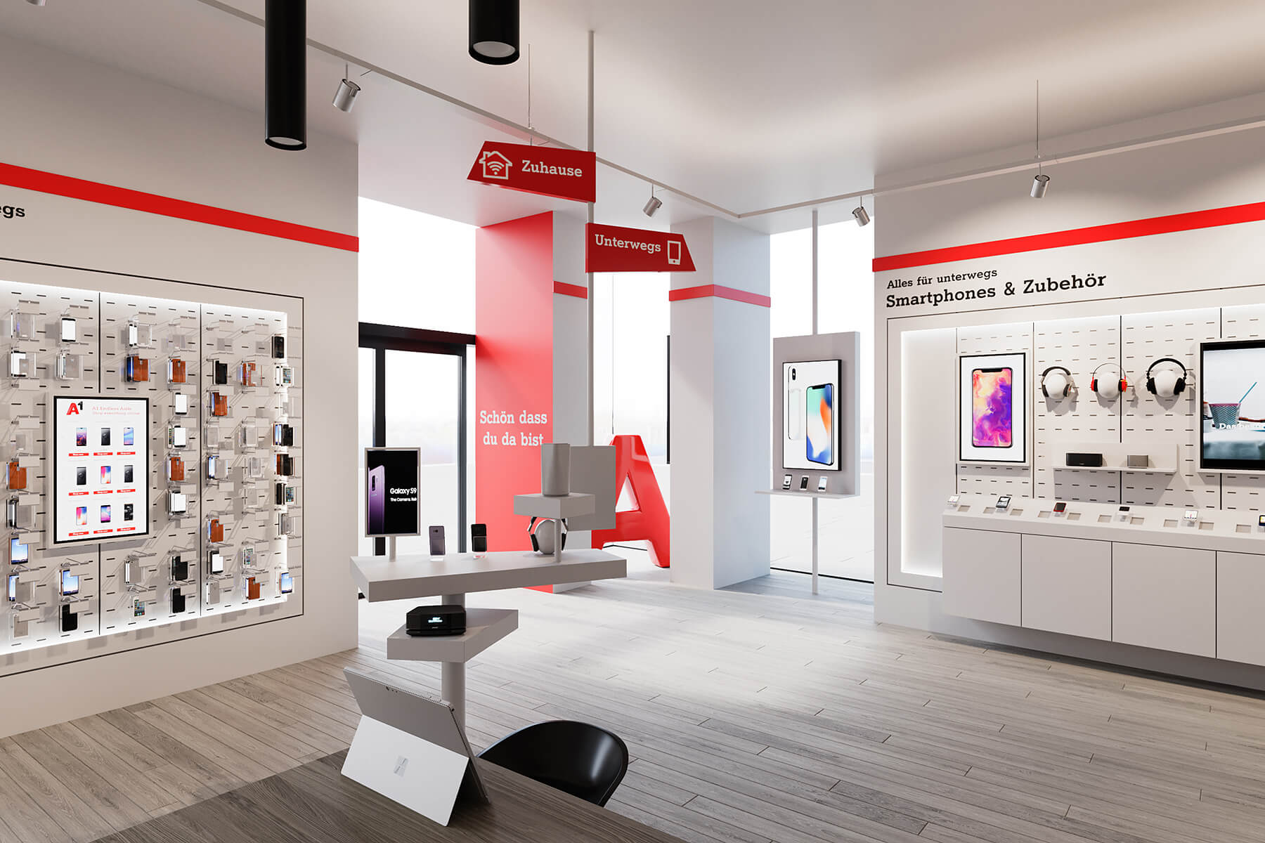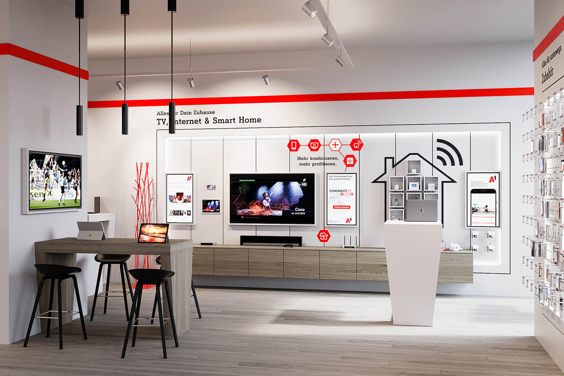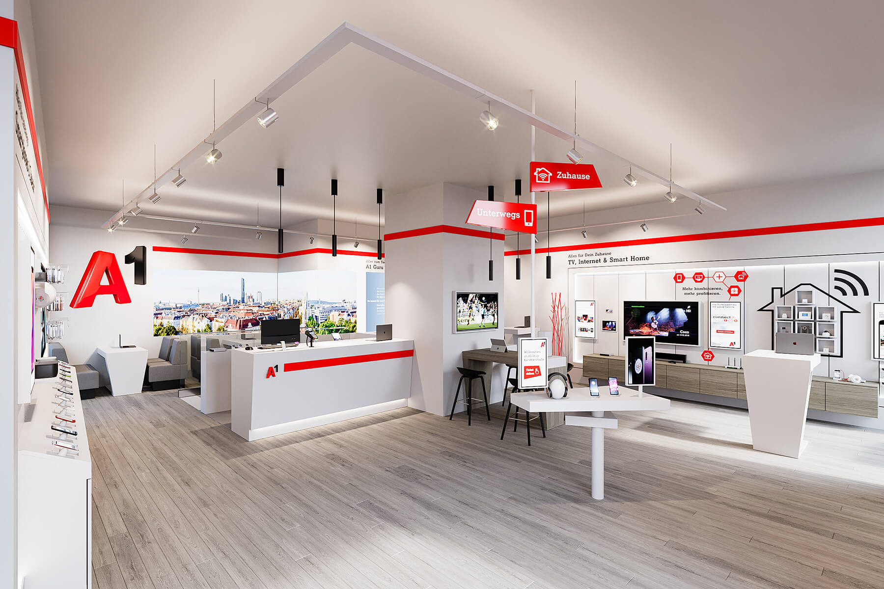 Durch den Einsatz einer neuen multifunktionalen Einrichtung mit integrierter Technologie werden die Produkte und Leistungen von A1 noch besser vermittelt.