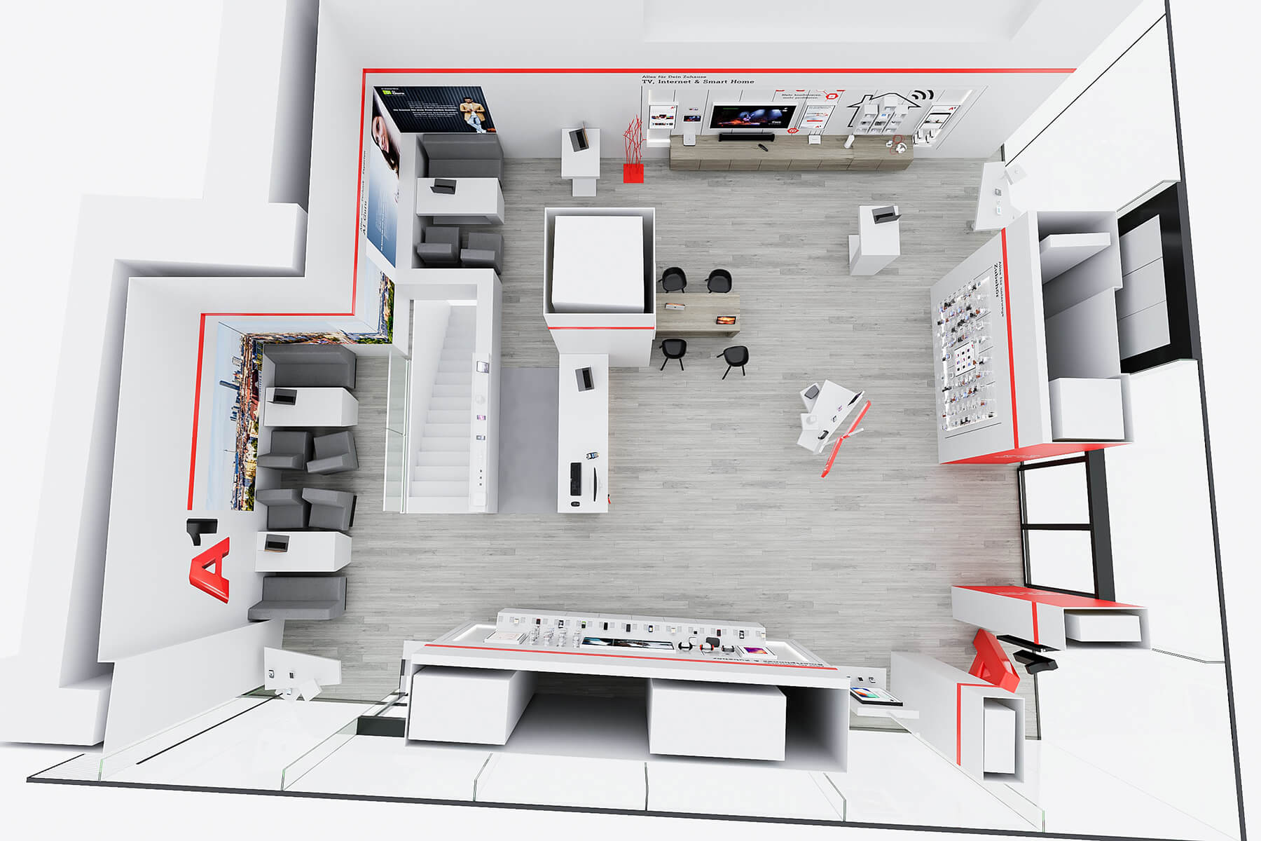 Das neue Shop Konzept und die dazugehörige Möblierung wurde gemeinsam mit der A1 entwickelt. In der Kärntner Straße erfolgte die erste Umsetzung. Der neue Shop ist in verschiedene Zonen gegliedert um den Kunden die bestmögliche Orientierung und Beratung zu bieten.