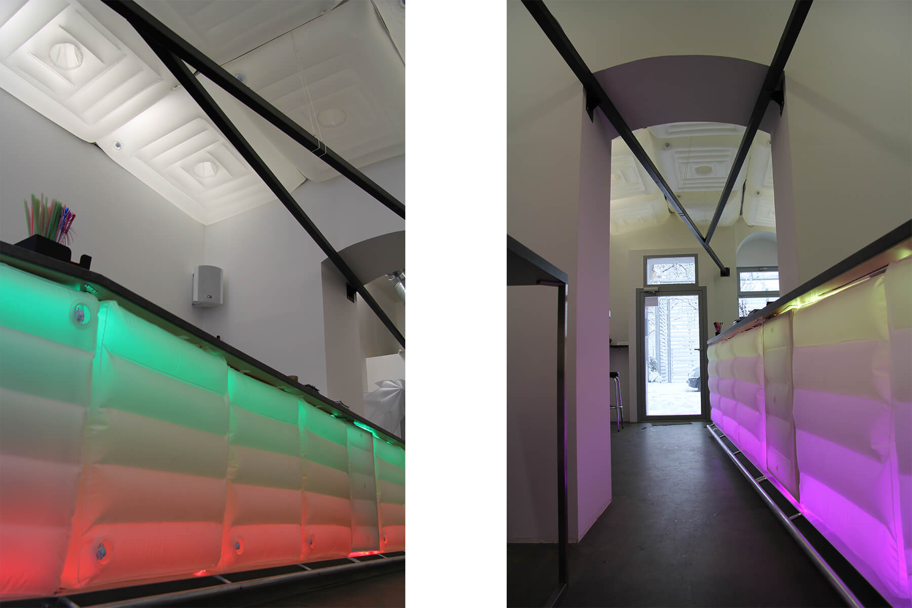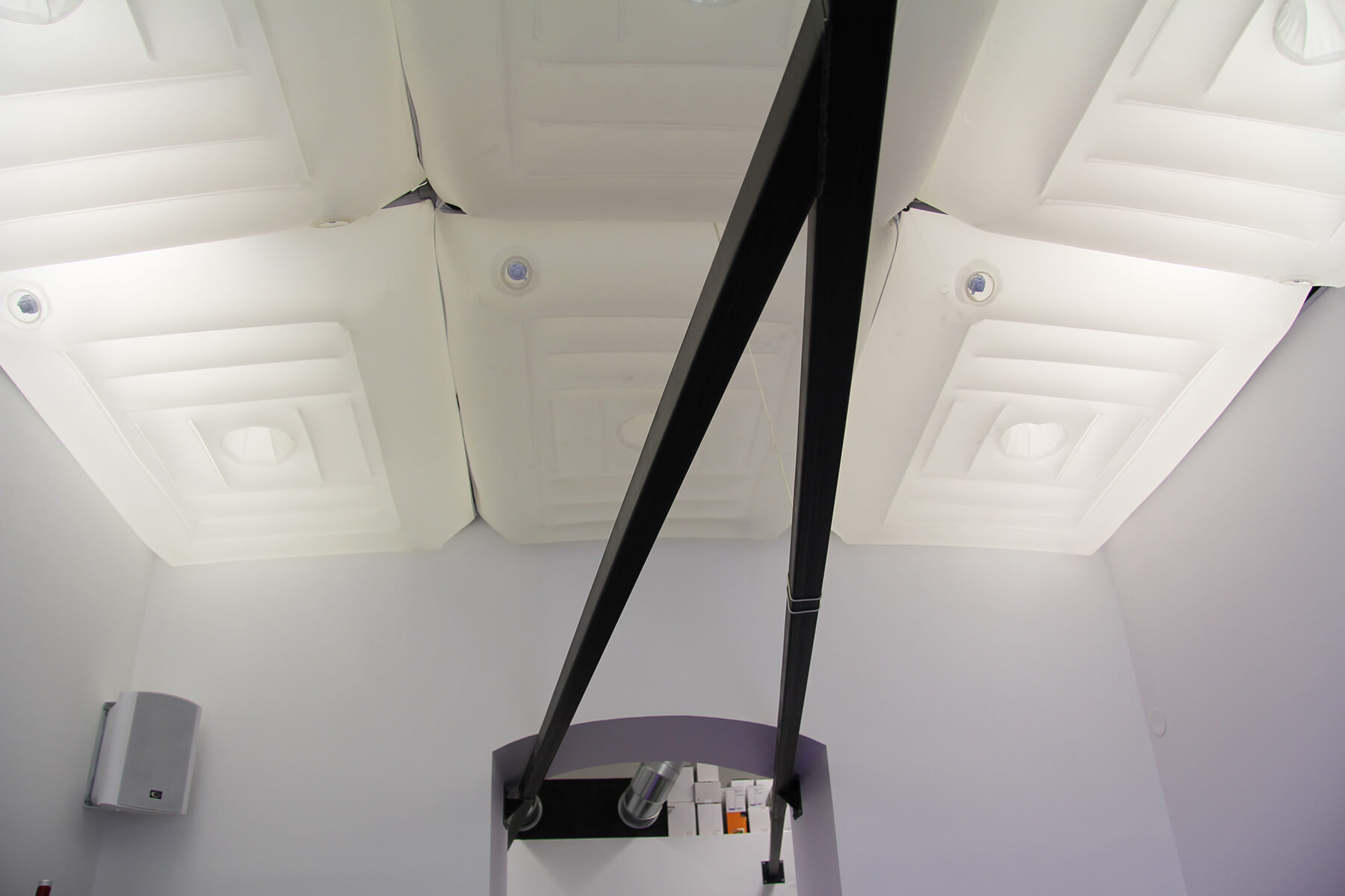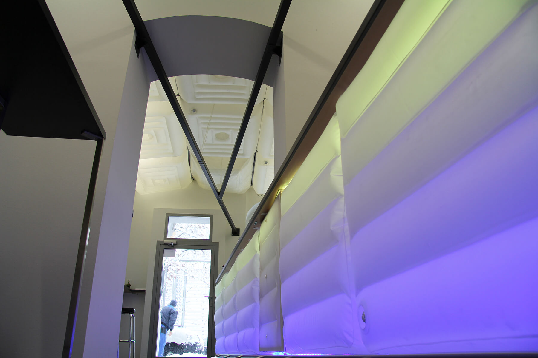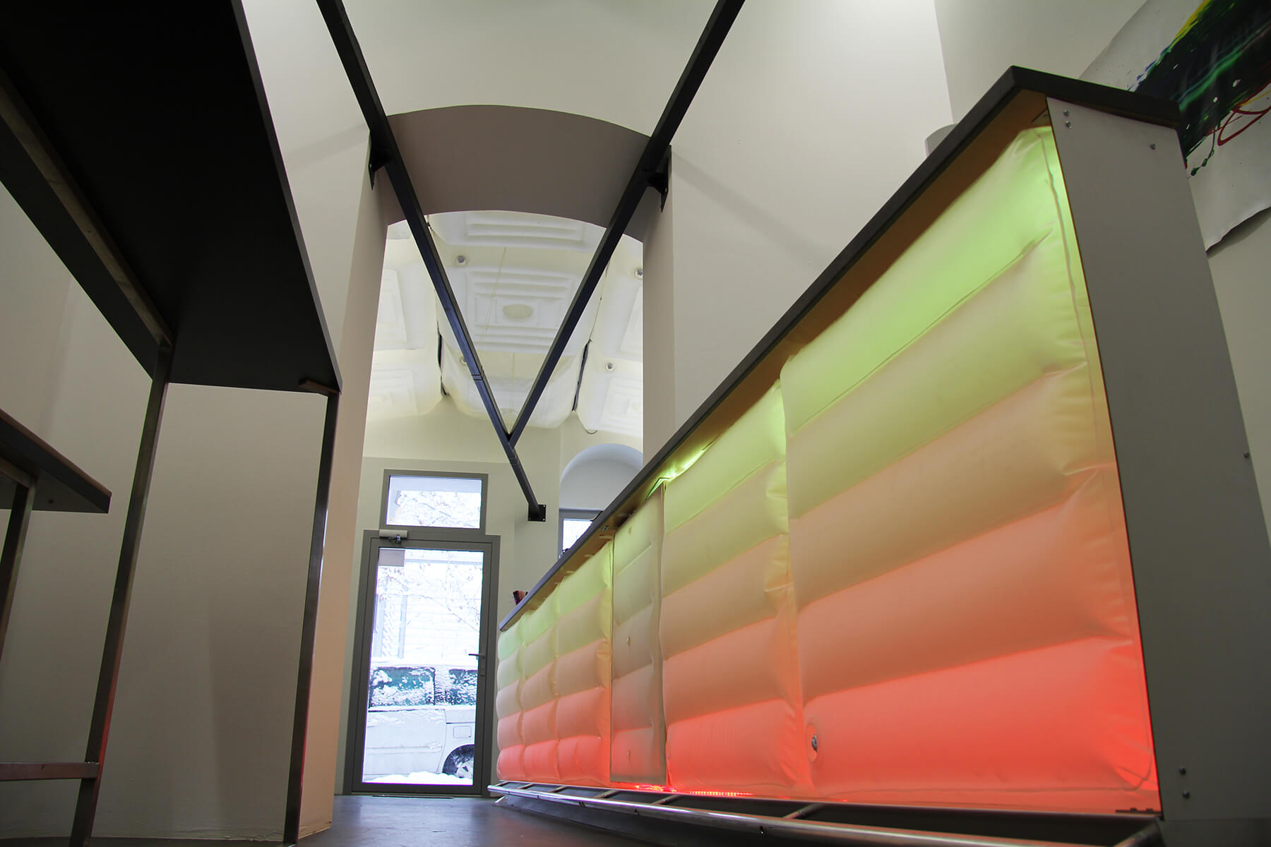Der nüchterne monochrome Innenausbau kontrastiert mit den hinterleuchteten Pneuinstallationen des Künstlers.