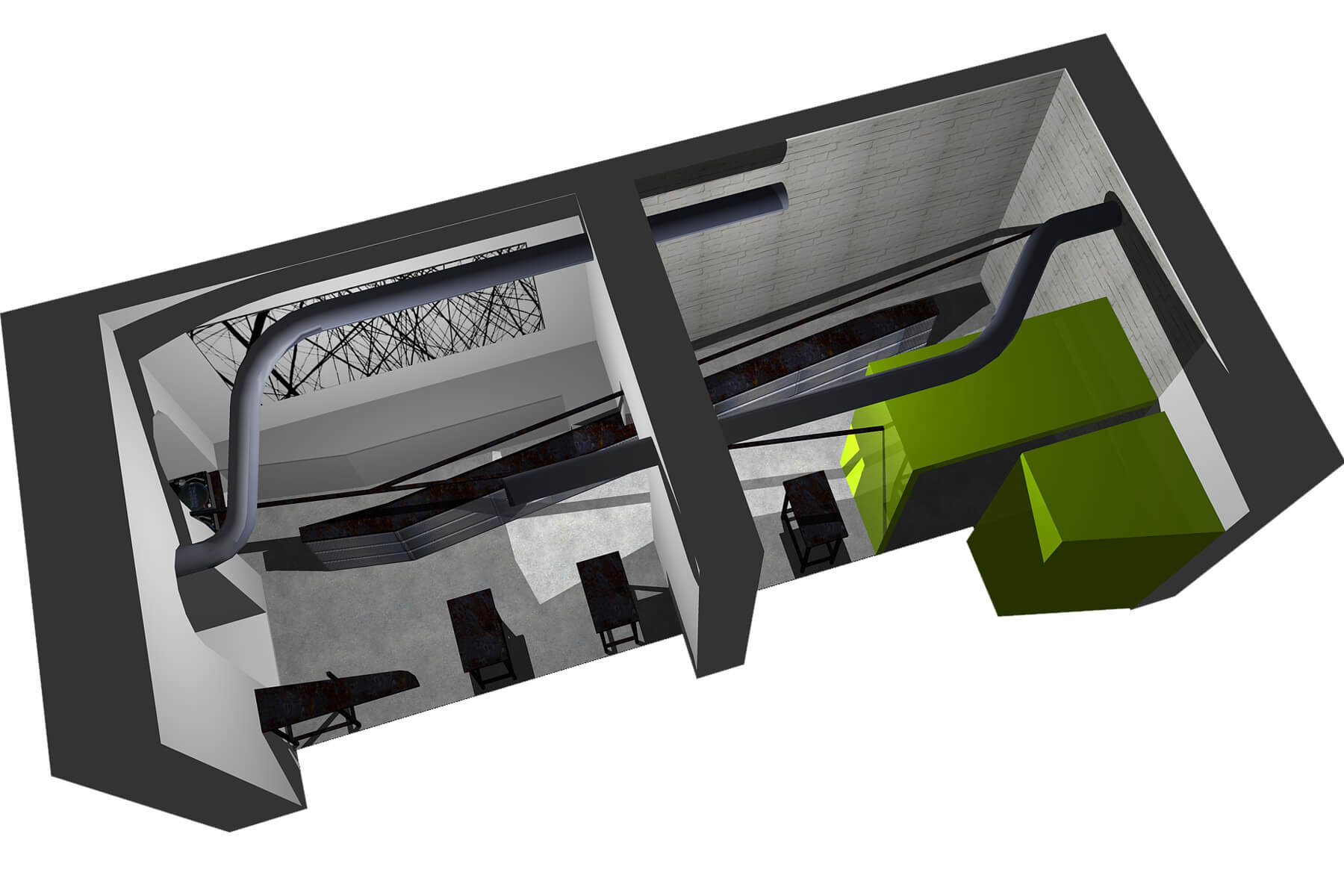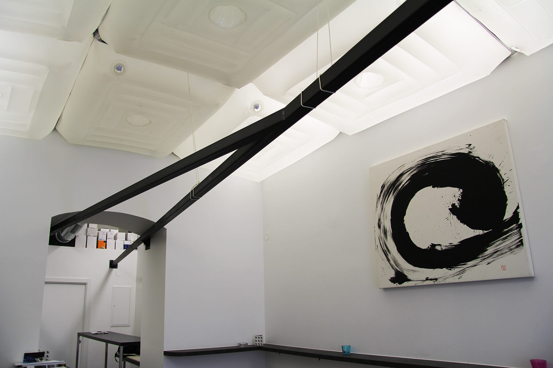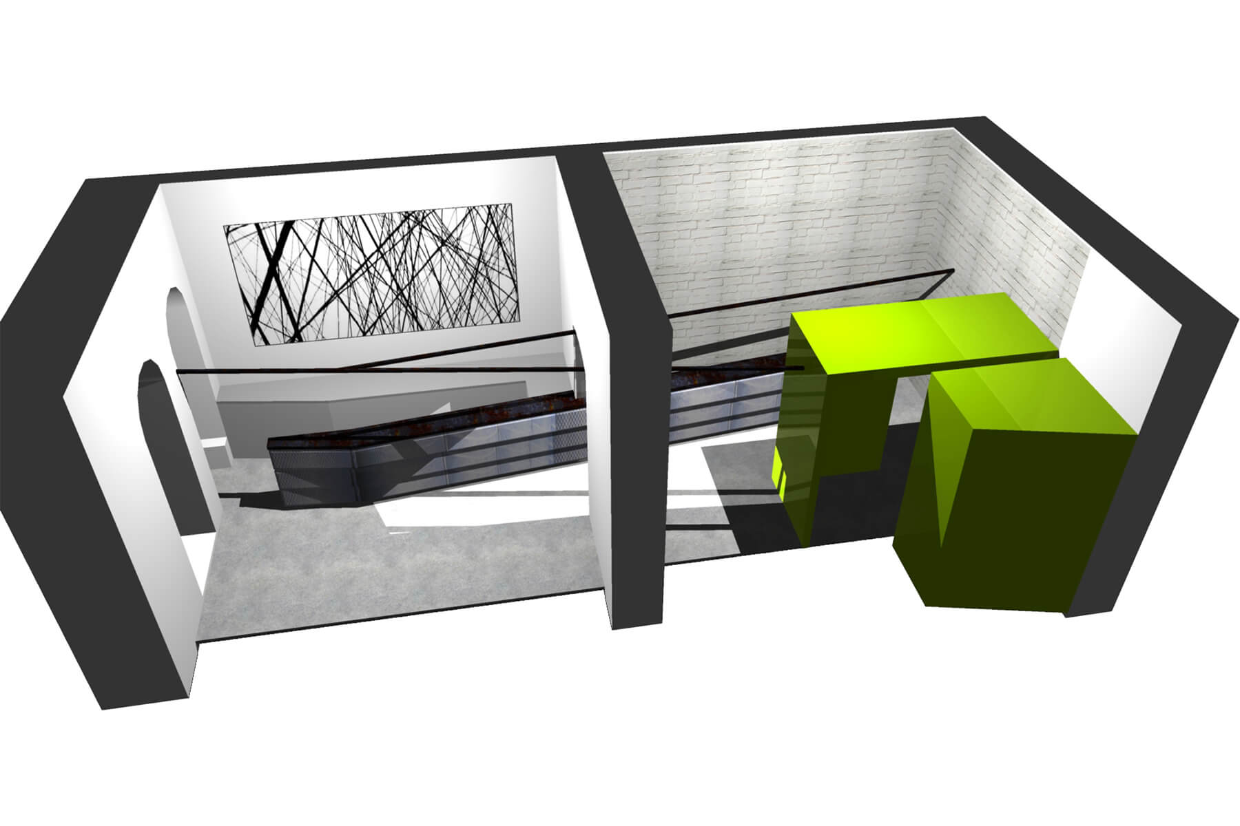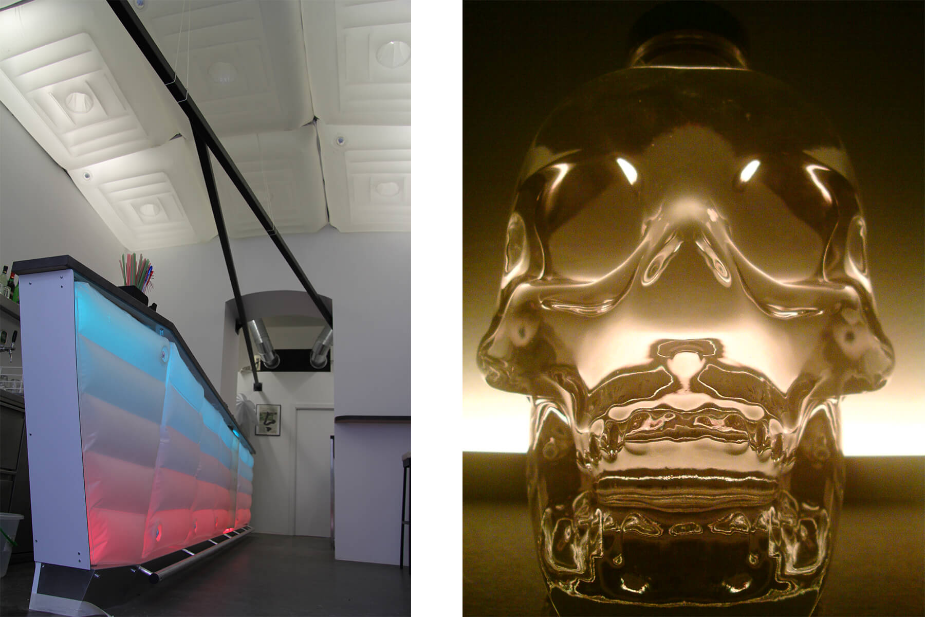 Der nüchterne monochrome Innenausbau kontrastiert mit den hinterleuchteten Pneuinstallationen des Künstlers.