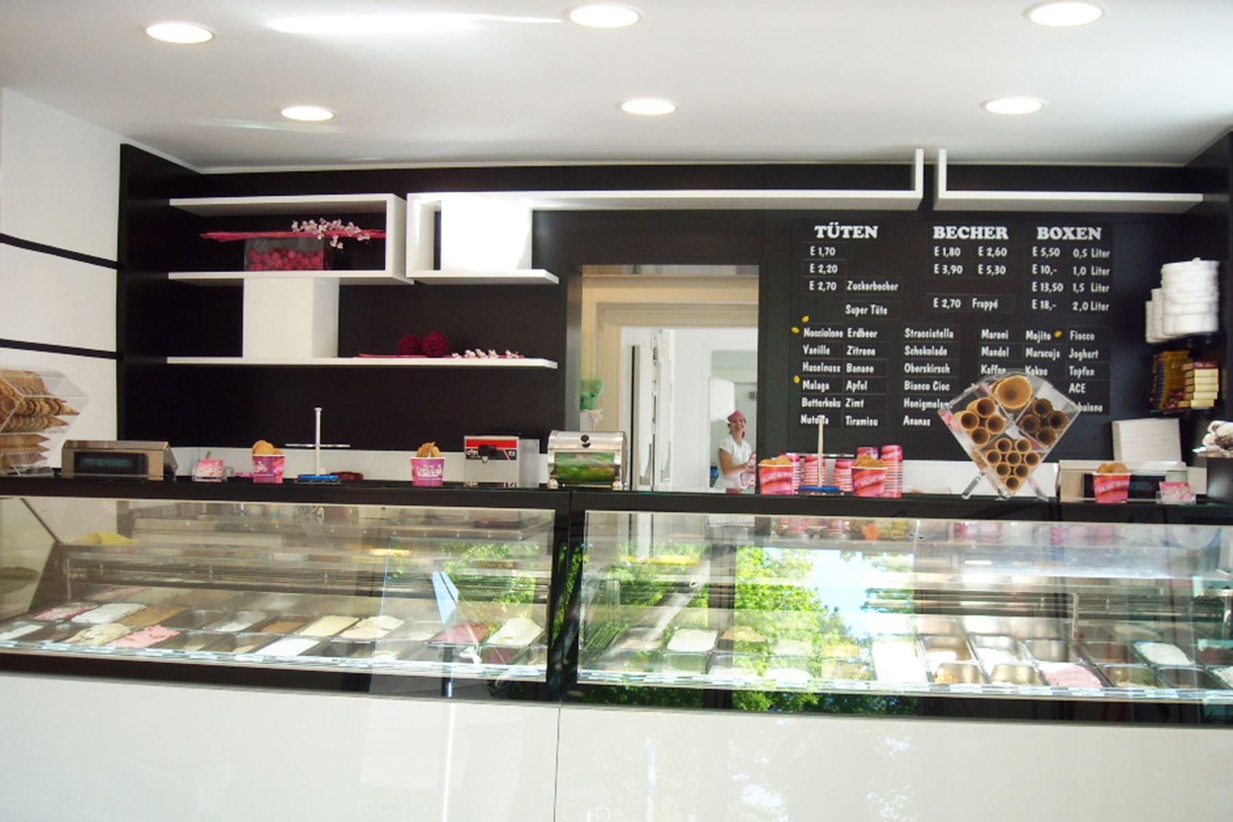 Der bestehende Eissalon „Isola Bella“ in Groß-Enzersdorf wurde adaptiert und umgebaut. Der Kundenbereich vergrößert, die Produktionsräumlichkeiten verlegt. Die reduzierte Inneneinrichtung – gestalterisch beschränkt auf geradlinige Schwarz/Weiß-Akzente – und die Verwendung der auf optimale Funktionalität ausgerichteten italienischen Eisvitrinen und Produktionsmaschinen bilden die Kulisse eines beschwingten und freundlichen Alltags des Eissalongeschehens. Die Außenwerbung ist als Weiterführung der Corporate Identity vom Verkaufsraum in die Fassadenflächen im Erdgeschossbereich gezogen und als Wandpaneelkonstruktion mit integrierten, hinterleuchteten Leuchtkastenflächen ausgebildet.