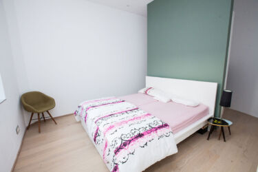 Diese dient als Badezimmer, Raumtrenner zum Privatbereich (Schlafzimmer, Schrankraum) und Küchenrückwand. Im Eingangsbereich befindet sich eine Gästebad und ein Kinderzimmer.