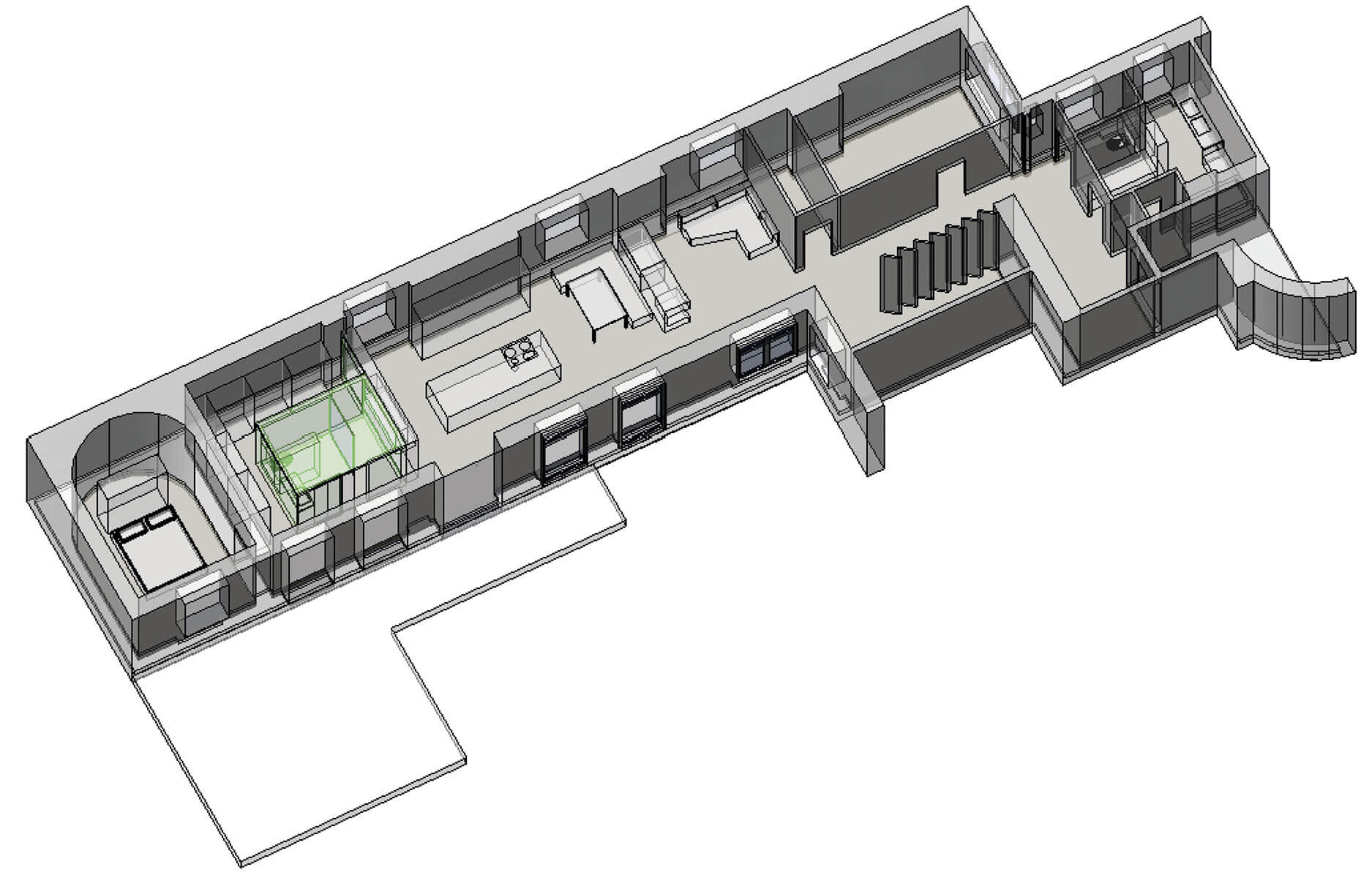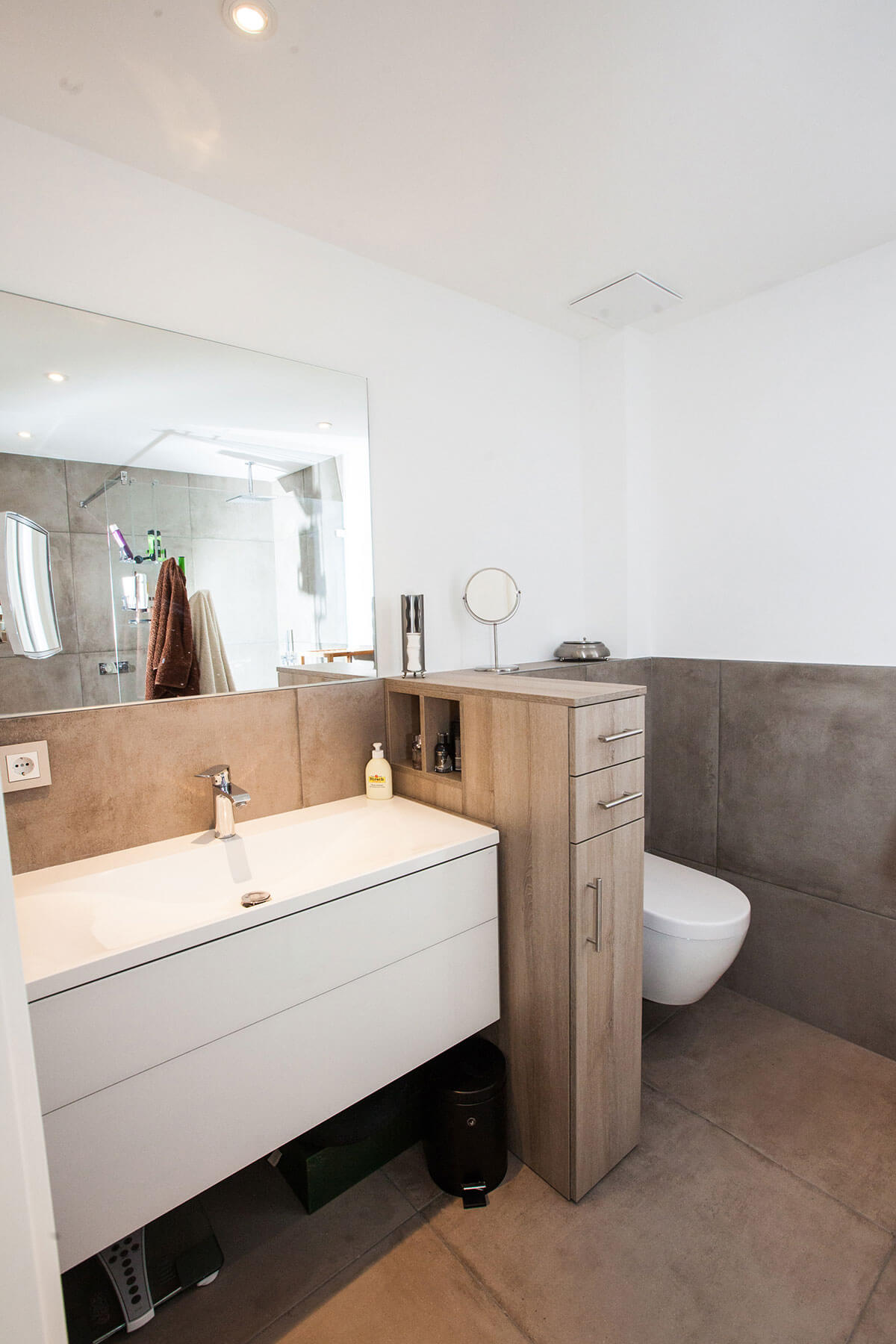 Diese dient als Badezimmer, Raumtrenner zum Privatbereich (Schlafzimmer, Schrankraum) und Küchenrückwand. Im Eingangsbereich befindet sich eine Gästebad und ein Kinderzimmer.