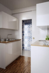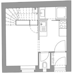 Im Hofgebäude eines Gründerzeithauses befand sich die 22 m² große Hausbesorgerwohnung. Diese wurde parifiziert und saniert. Nach dem Abbruch der oberen Decke wurde eine 8 m² Schlafgalerie eingezogen. Die Wohn und Schlafebene haben wir durch eine Stiege, kombiniert mit einem raumhohen Schrank verbunden, in dem auch ein Abstellraum enthalten ist. Hinter der Küche wurde ein kleines Badezimmer eingebaut. Somit haben wir auf 30 m² eine komplette Wohnung untergebracht. Wohnen, Schlafen, Stauraum, Küche, Bad, WC. Hier ist nichts zu viel und nichts zu wenig.