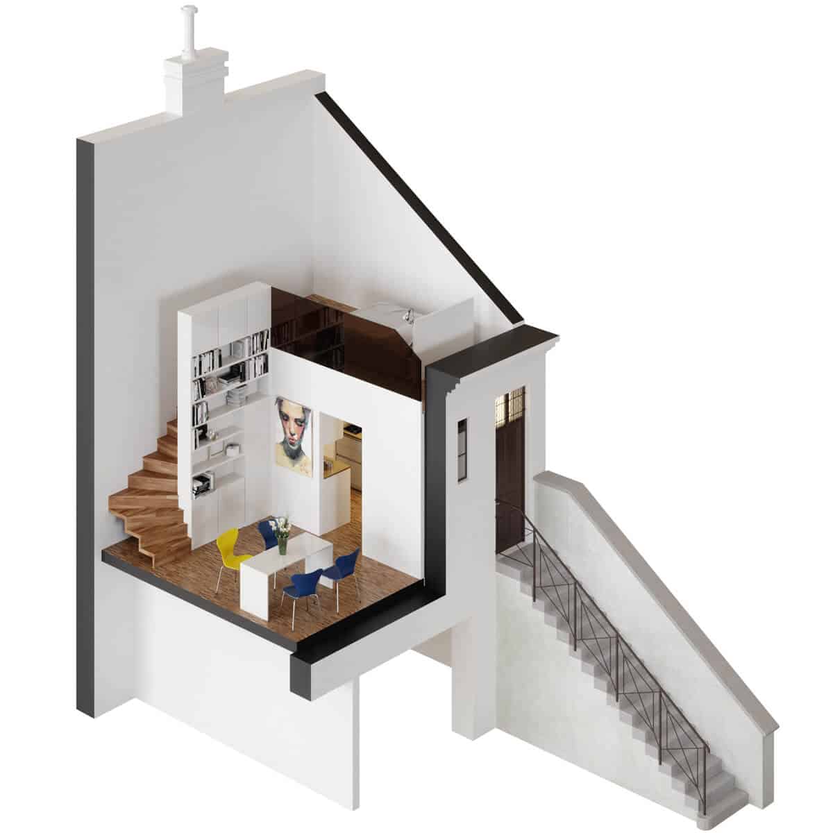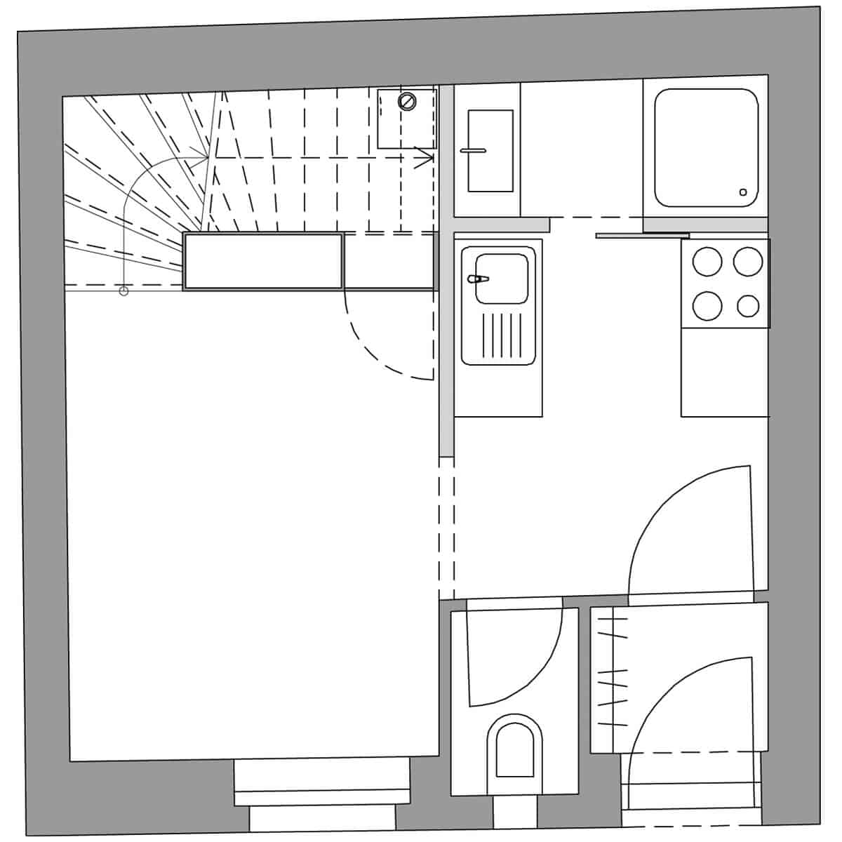 Im Hofgebäude eines Gründerzeithauses befand sich die 22 m² große Hausbesorgerwohnung. Diese wurde parifiziert und saniert. Nach dem Abbruch der oberen Decke wurde eine 8 m² Schlafgalerie eingezogen. Die Wohn und Schlafebene haben wir durch eine Stiege, kombiniert mit einem raumhohen Schrank verbunden, in dem auch ein Abstellraum enthalten ist. Hinter der Küche wurde ein kleines Badezimmer eingebaut. Somit haben wir auf 30 m² eine komplette Wohnung untergebracht. Wohnen, Schlafen, Stauraum, Küche, Bad, WC. Hier ist nichts zu viel und nichts zu wenig.