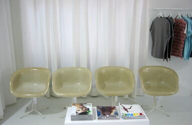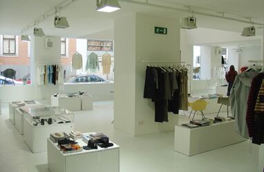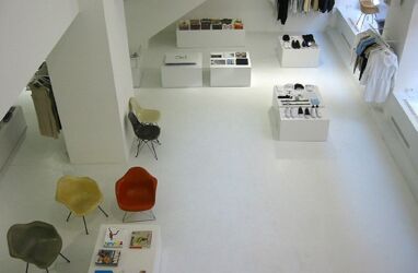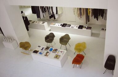 Neutrales Weiß bildet den Hintergrund für das Wesentliche. Ein auf zwei Ebenen geführter weitläufiger Verkaufsraum (rund 480 m2) überlässt somit in nobler Zurückhaltung die Show stets dem „Anderen“: den Kleidungsstücken, den ebenfalls käuflich erwerbbaren und sorgfältig ausgewählten Eames- Möbel-Klassikern, den arrangierten Accessoires. Die Präsentationselemente sind beweglich, der Raum somit dem engagierten Geschäftskonzept entsprechend in hohem Maße nutzungsneutral. Auf Pulten liegen Lookbooks, Kunstbücher, Magazine, die auf die im Shop vorhandenen Produkte verweisen, Buchempfehlungen der jeweils ausstellenden Designer ziehen einen erweiterten Kommunikationskreis rund um das Thema Mode und Alltagskultur. (Text: Gabriele Kaiser)