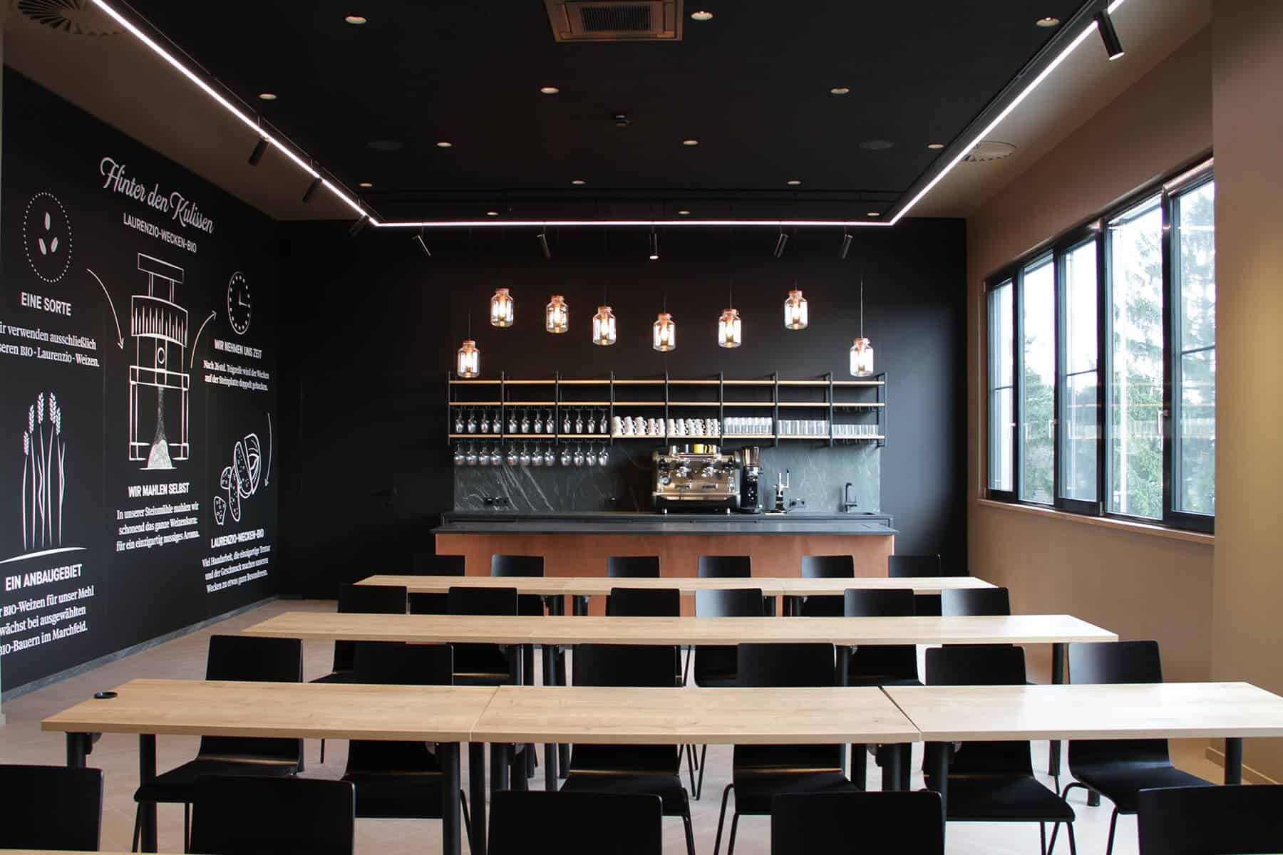 In den bestehenden Strukturen der Ströck Zentrale wurde ein repräsentativer Präsentationsbereich errichtet. Dieser umfasst einen mit modernster Technik ausgestatteten Präsentationsraum, sowie angeschlossene Nebenbereiche wie Versorgungsküche, Sanitärräume und ein exklusives Büro.