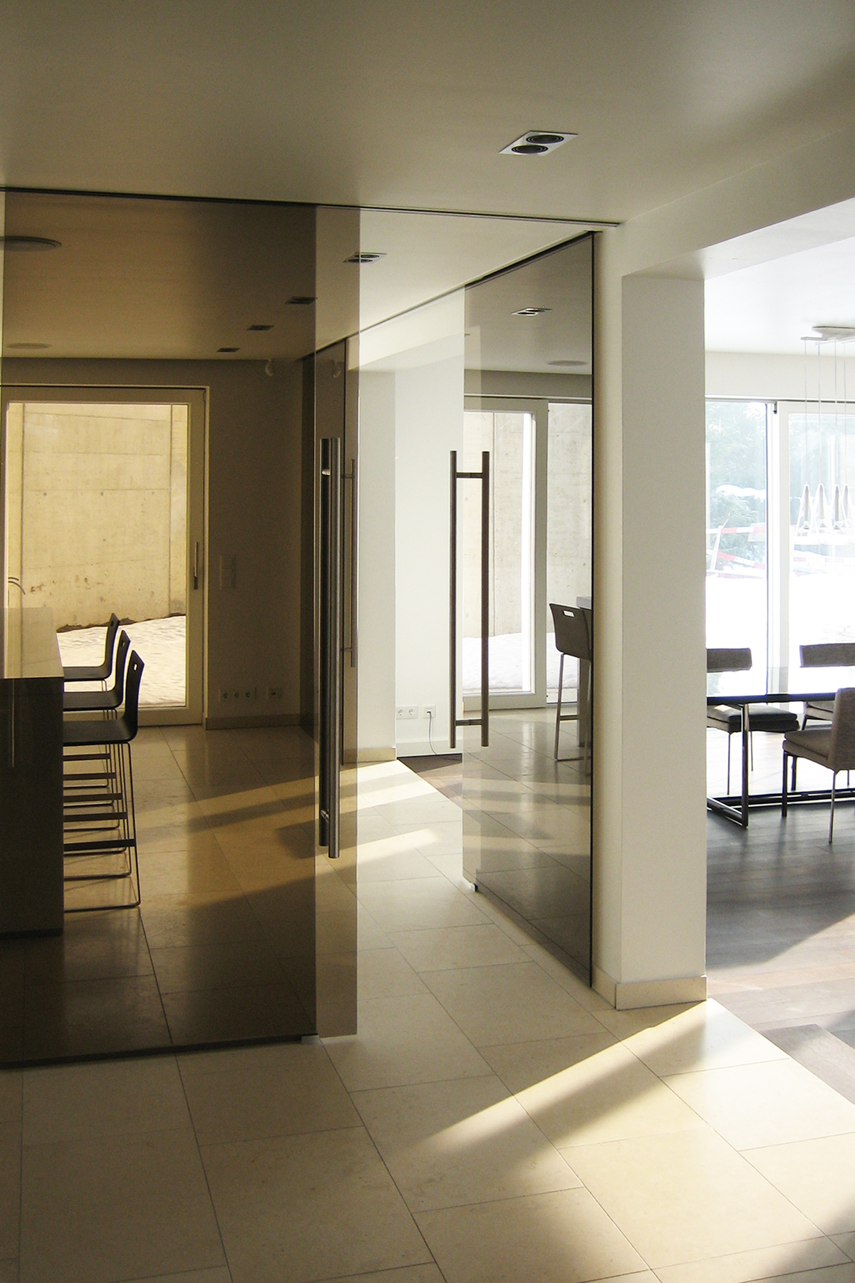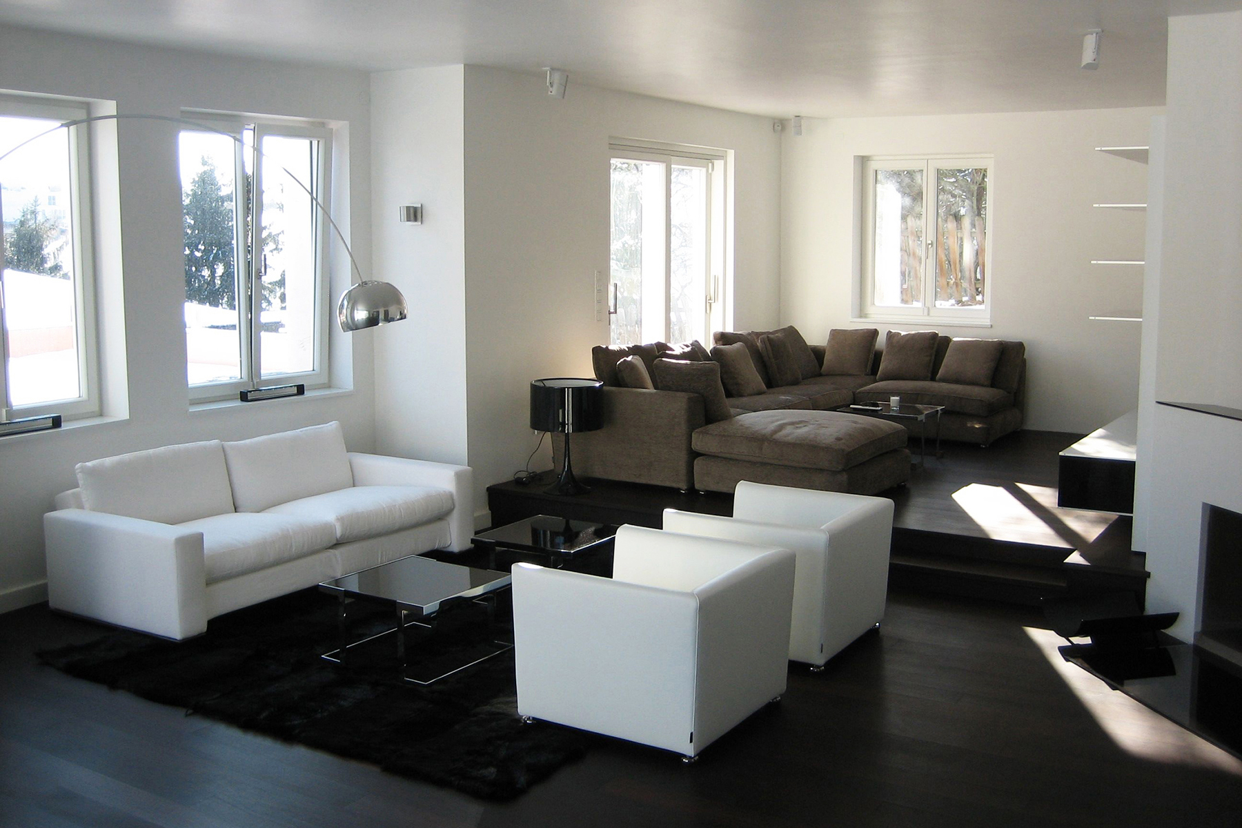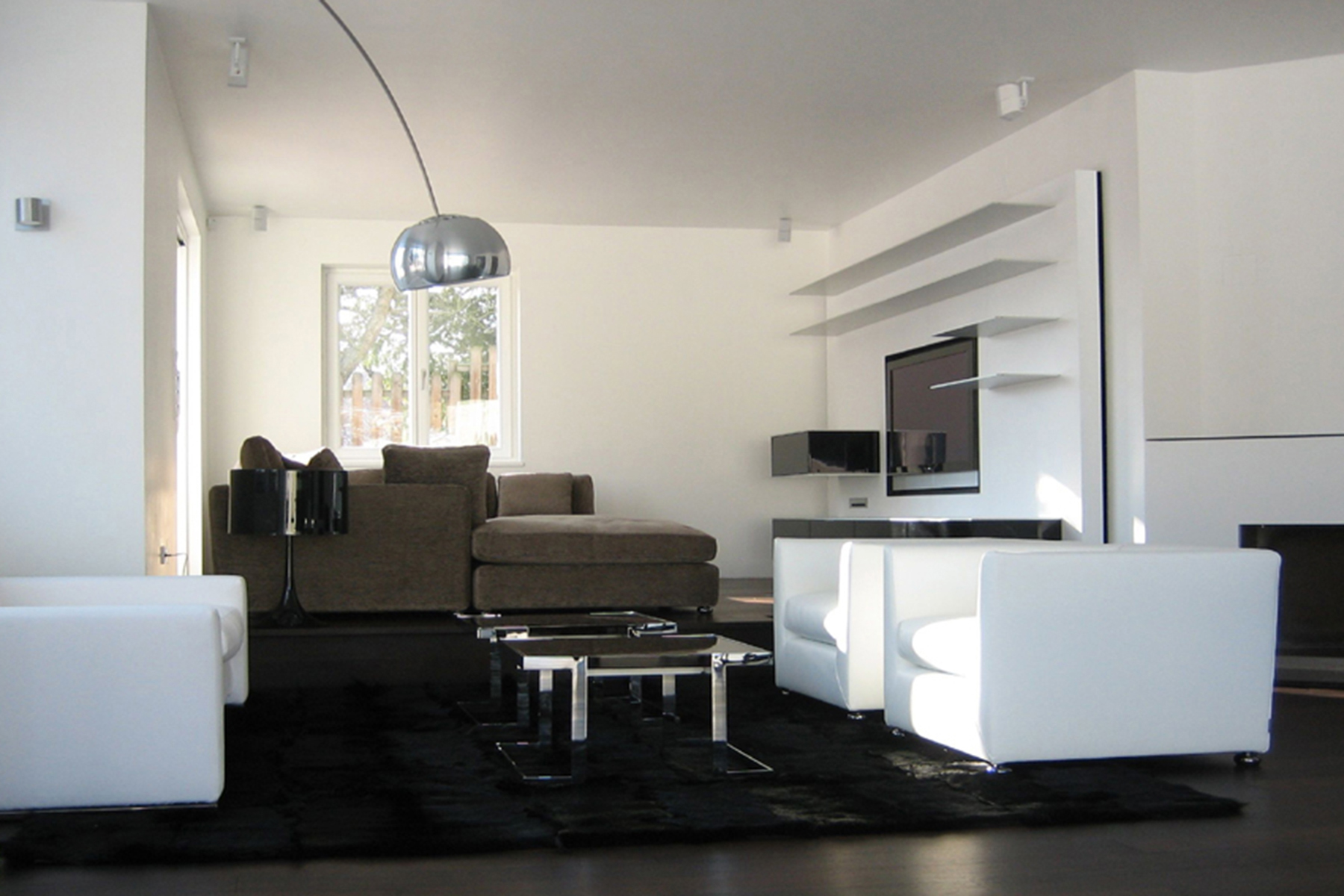 So entstand im Erdgeschoss ein 90m² großer Wohn-, Ess- und Kochbereich. Notwendige Abtrennungen wurden durch Glasschiebetüren erreicht um den Lichteinfall nicht zu behindern und die offene Atmosphäre zu erhalten. Im Zuge der Sanierung wurden auch gleich alte Bausünden behoben. Viel Licht, gerade Linien und weiß als neutraler Hintergrund prägen den Wohnbereich, während im Keller ein hauptsächlich in schwarz gehaltener Wellnessbereich sowie eine Einliegerwohnung als Minimalwohneinheit geschaffen wurde.